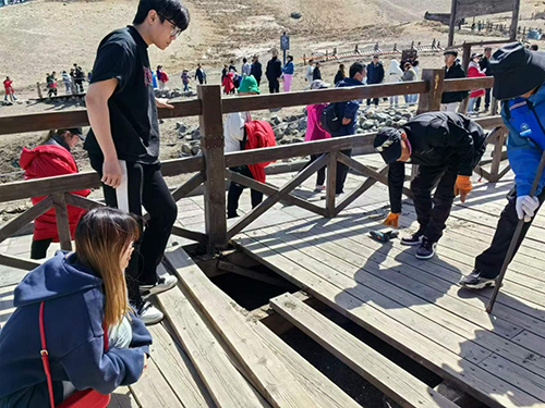 主峰管理員于子成見狀趕緊上前詢問,并立即將情況報告組長楊曉旭。由于天池主峰特殊的火山砂礫地質環境,給尋找一枚小小的戒指增加了相當大的難度。楊曉旭一邊安撫游客情緒,一邊詢問游覽線路范圍,幫助兩人回想戒指遺失的大概位置。同時組織員工們在二人走過的游覽線路之間,一寸一寸仔細尋找,最終將戒指遺失位置鎖定在木板棧道縫隙下。最后通過拆除了二十余塊木板,終于找到了“藏”在棧道下的金戒指。邵先生拿到戒指十分感動,當即拿出“紅包”表示感謝,主峰管理部員工們果斷拒絕:“這都是我們應該做的,你們的滿意和認可就是對我們最大的支持和鼓勵”。